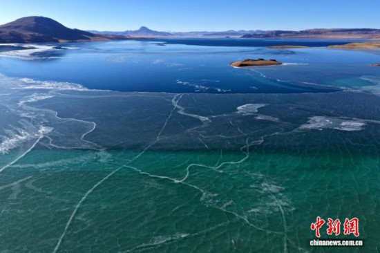 12月20日,航拍错鄂湖。错鄂湖,位于西藏那曲市申扎县境内,是色林错的卫星湖。冬日错鄂湖在阳光照耀下,湖泊呈现蓝、绿等多种颜色,景色迷人。
